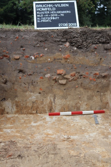 In einer als Lehrgrabung geplanten Kampagne sollte ein 40 × 4 m langer Sondageschnitt im Osten des Heiligenbergs freigelegt werden, da die geophysikalischen Prospektionen hier lineare Strukturen zeigten. Beim Abbaggern des Oberbodens konnte ein ausgedehntes Stratum (= Schicht) aus modernem Bauschutt und zerbrochenen Flaschen, Keramikbruch und Porzellan erfasst werden. Die prospektierten Strukturen erwiesen sich als lineare Bänder, die vom Abladen des Schutts durch Traktoren herrührten. Um eine Beurteilung der Befundsituation mittelalterlicher Siedlungsschichten zu ermöglichen, wurde im Norden und Süden des Schnitts tiefer gebaggert. Interessanterweise zeigte sich dabei, dass das Schuttstratum im Norden nur wenige Dezimeter und punktuell überhaupt nicht vorhanden war; dagegen ließ sich im Süden eine Auflage von mehr als 1 m erkennen.