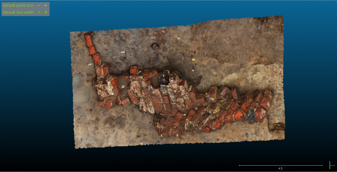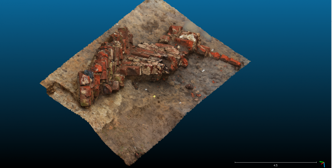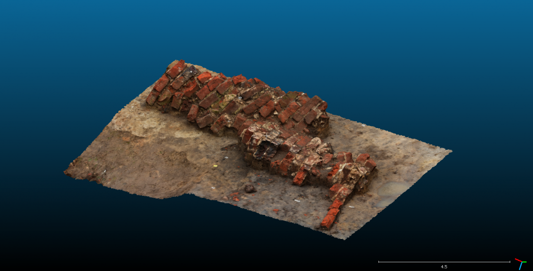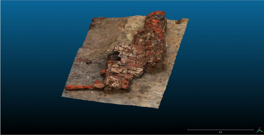 Nicht in die spätmittelalterlichen Schichten einfügen lässt sich die Mauerecke. Sie ist zwar teilweise in die jüngere Schuttschicht eingebettet, allerdings gibt ihre während der Ausgrabungen 2019 freigelegte Basis einen deutlichen Anhaltspunkt für eine andere Datierung. Das Mauerwerk ließ sich in den unteren zwei bis drei Backsteinlagen als doppelschalig erkennen, wohingegen das Aufgehende als einschalig anzusprechen ist. Der Mauerfuß schloss sich ohne Bruch an das verstürzte Mauerwerk an, was dafür spricht, dass das Bauwerk ohne Fundament direkt auf die Geländeoberfläche gebaut wurde.