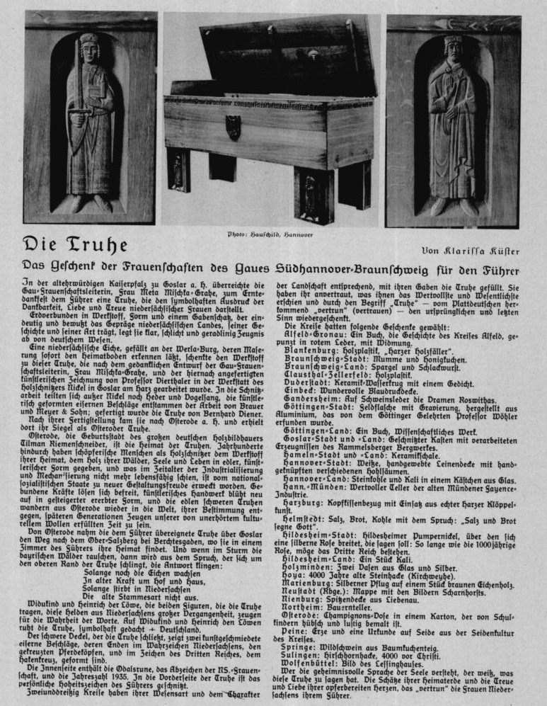 In der N.S. Frauenwarte, einer Zeitschrift für Frauen im 3. Reich, berichtete die Autorin Klarissa Küster, dass die Truhe von Hitler in Goslar entgegen genommen worden sei. Danach soll die Truhe in einem Zimmer im Berghof am Obersalzberg aufgestellt worden sein. Der Berghof war spätestens seit 1936 privater Wohnsitz von Adolf Hitler.