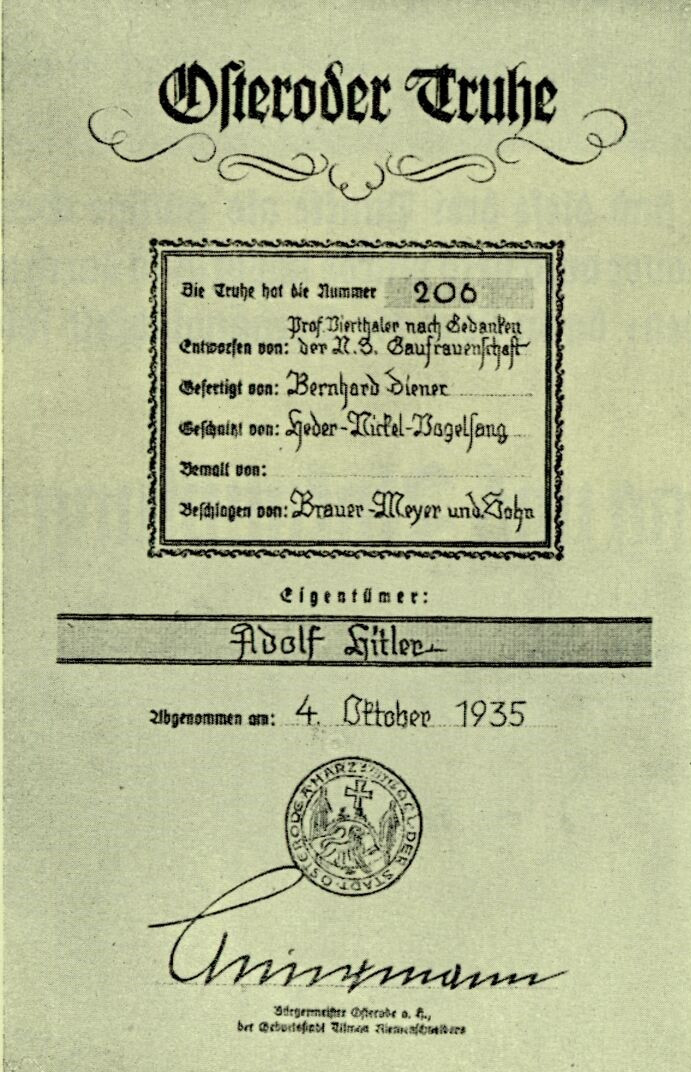 Zwar hat die Recherche noch keine Abbildung der für Hitler bestimmten Truhe ergeben, aber die vom Bürgermeister von Osterode für diese Truhe ausgestellte Urkunde ist in einem Katalog zur Osteroder Truhe publiziert worden.