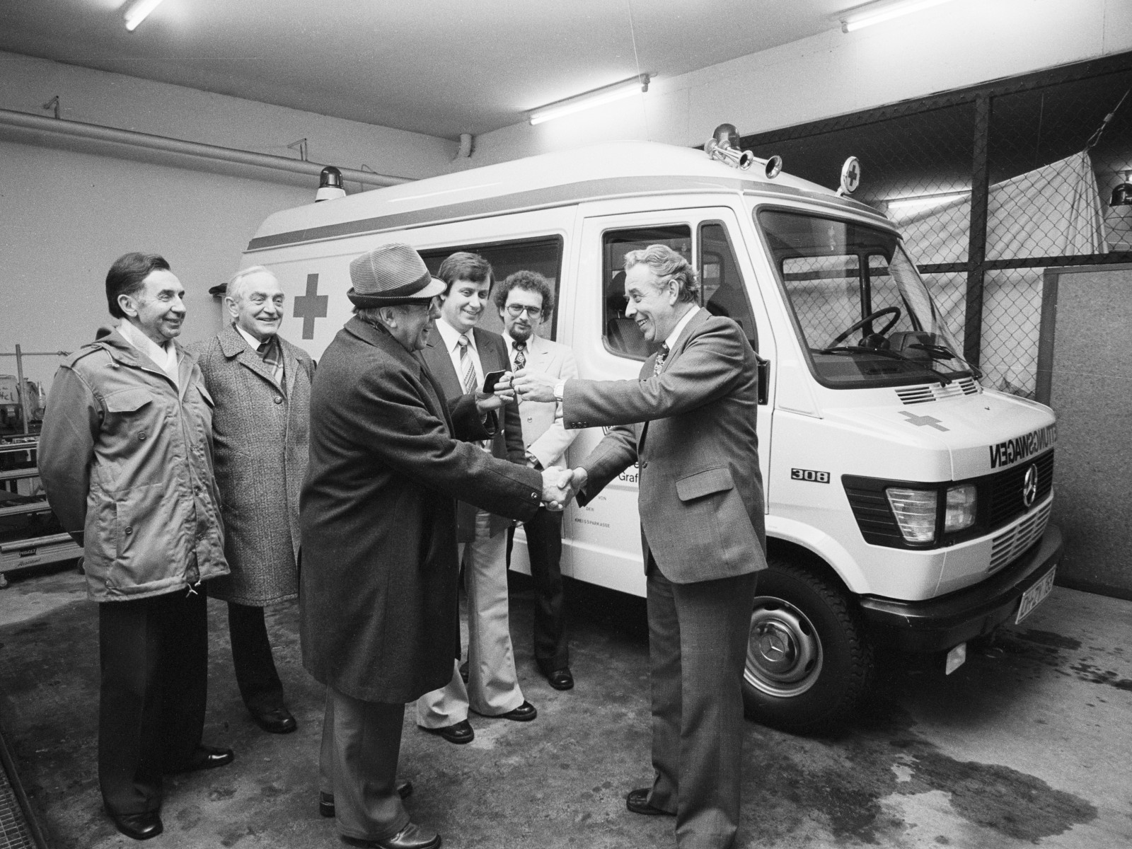 „Mobile Mini-Klinik gestern ihrer Bestimmung übergeben“ hieß es am 10. Januar 1979 in der Kreiszeitung. Der Sparkassendirektor Werner Peter (rechts) übergab die Schlüssel an den Ehrenvorsitzenden des DRK Dr. Siebert-Meyer. Die moderne Ausstattung ermöglichte die Durchführung von Notfallmaßnahmen direkt im Rettungswagen. Dadurch erhöhte sich Überlebenschance der Verletzten deutlich.